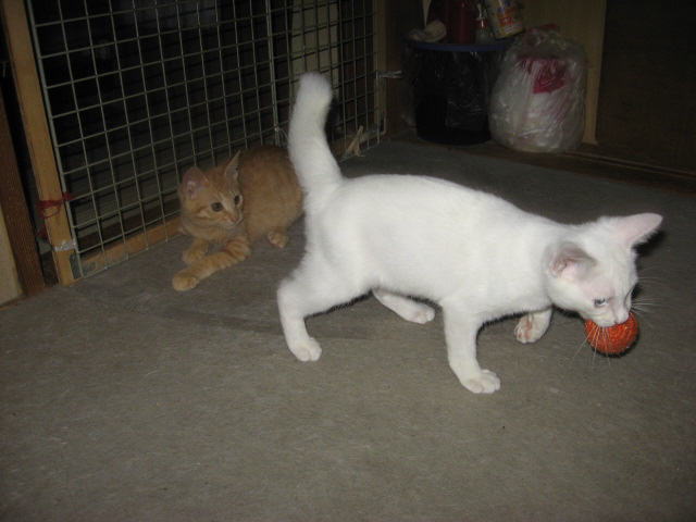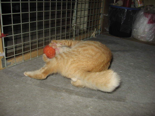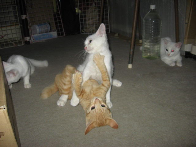 僕、剛♂でちゅ。まだ独り遊びしてるでちゅ。剛♂でちゅ。僕のママにゃんが、僕が2ヶ月目になった、7月11日に、車に轢かれて亡くなったでちゅ。仕事から夜帰ってきた父タンが、白猫が家の前の道路で轢かれてる~と慌てて飛び込んで来て、即、母タンと外に出て、連れて来たら。。。剛のママにゃんだぁ~夕方ぐらいに轢かれたのかなぁ~?と母タンが言ってた。翌日、埋葬したでちゅ。チビコママにゃんは、将♂兄ちゃんと兄妹(姉弟)でちゅ。チビコママにゃんと、将♂兄ちゃんは、シロコにゃんの子供でちゅ。それと、元気兄ちゃん達のシロコママにゃんは、1月の中頃から、帰って来なくなった。多分、お星様になってるだろうなぁ~と母タンが言ってたでちゅ。みんにゃのコシロパパにゃんは、6月の中頃から帰って来なくなった。多分、お星様になってるだろうなぁ~と母タンが言ってたでちゅ。父タンと母タンが、僕、剛♂の兄妹(姉弟)を探してまちゅ。初産でも、2~5匹ぐらい、生んでるかも~~と、母タンが言ったら。。。父タンが、○にゃんこ連れて来たみたいだなぁ~最初の頃は、鳴き声が聞こえなかったけど、ママにゃんがいなくなってから鳴き声が聞こえてる~と。父タンも母タンも、2~3ヶ月では、生き延びるのが難しいから、見つけないと~~と言ってたでちゅ。みんにゃ出てきてくれるといいでちゅが。。。早く見つけてくれるといいのでちゅが。。。昼間、子猫探しで小屋でガサゴソ。余りの暑さで、クラクラしてて倒れそうになり、部屋に戻ってクーラー点けて涼んでた。でも、疲れたので、読み逃げ~足跡にゃん♪εεεεε(((((ヾ( o=^・ェ・)oです。m(._.*)m1日は~~最低気温24.6℃最高気温37.7℃朝から晴れ~~。今日も気温がグングン上がり、県内一の猛暑日~~。ε-(´o`;A アチィε-(´o`;A アチィ一日になりました。暑すぎて、倒れそうになって、お昼過ぎからエアコン点けてたよ~。様子見(=^-^=)達は、ふく♀ホワイト♂ボク♂の3にゃん毎日の飲み薬(=^-^=)達は、ふく♀ホワイト♂ボク♂の3にゃん3にゃんの薬は、缶詰に混ぜてます。まだまだ手がかかってます。申し訳ないですが、暫くは、コメントへのお返事は無理みたいです。