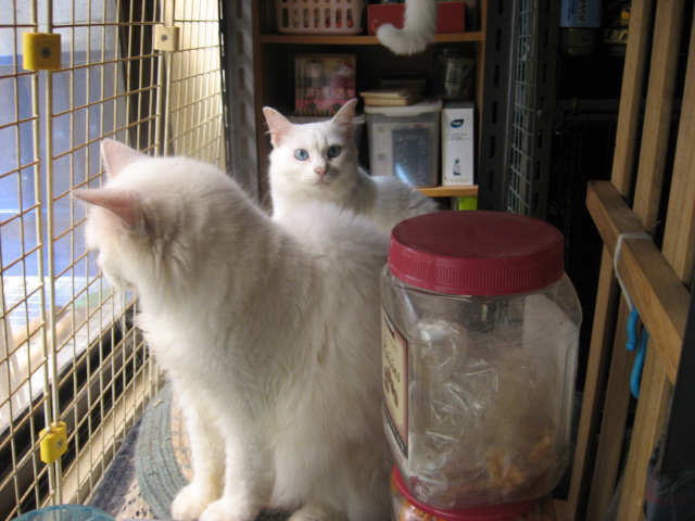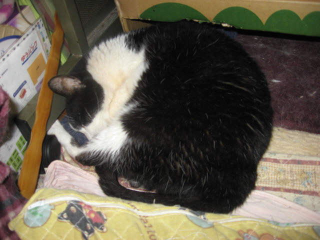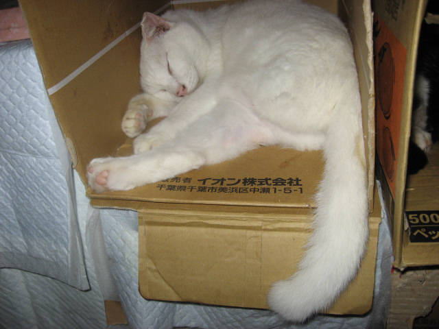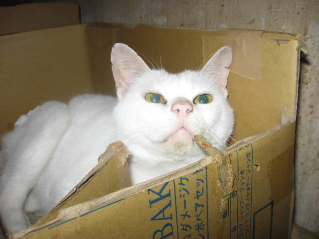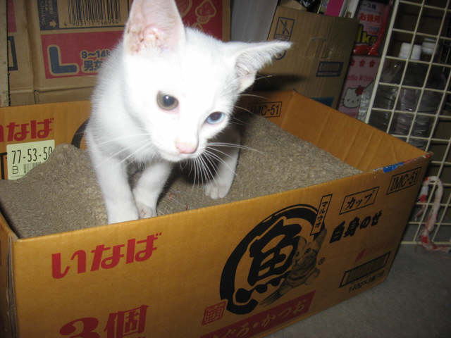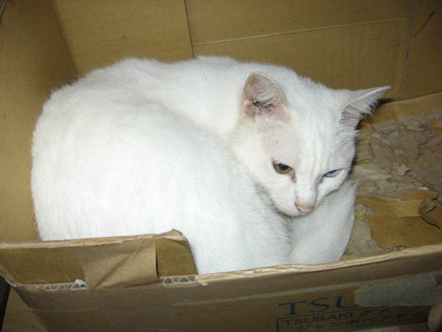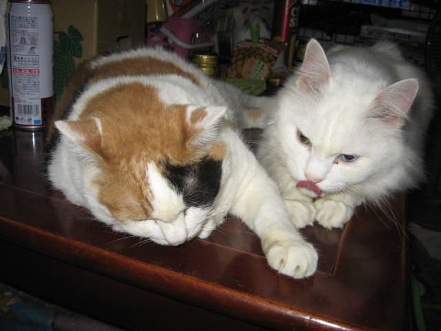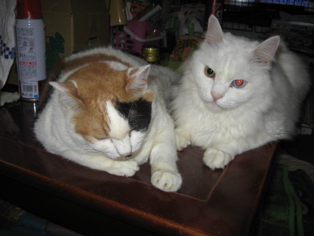 色つきにゃんことツーショット~。左はミコ♀右は純♂兄妹(姉弟)は、コタツの上で左はボク♂右はにゃんBOXの中に寅♂ボクは、にゃんBOXに入りたいのかなぁ~?それとも、順番待ち?左あい♀右ふく♀キッチンカウンターの下の箱の中(少しボケ気味ですが・・・)10日から、「新入り子にゃんこクイズ~3にゃんこの問題です」やってます。10日の日記を見てね。ご参加、お待ちしてま~~す。締め切りは、13日木曜日午前11時59分です。(お昼前です。)12日は~~最低気温23.8℃最高気温30.9℃午前中は時折、小雨がパラつく曇り空。午後2時過ぎから、雨が降ったり止んだり。午後6時半頃から、ザーザーと雨が降りだした。40分ぐらいで小雨になり、シトシトと降ってます。これで、暑さが一段落かなぁ~。様子見(=^-^=)達は、ふく♀ホワイト♂ボク♂の3にゃん毎日の飲み薬(=^-^=)達は、ふく♀ホワイト♂ボク♂の3にゃん3にゃんの薬は、缶詰に混ぜてます。まだまだ手がかかってます。申し訳ないですが、暫くは、コメントへのお返事は無理みたいです。