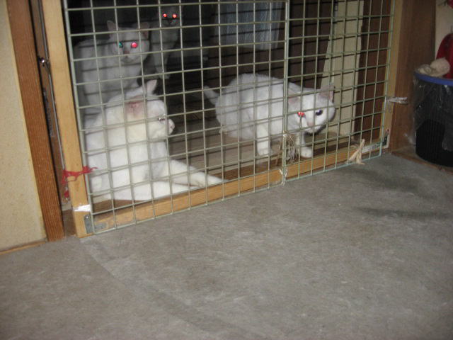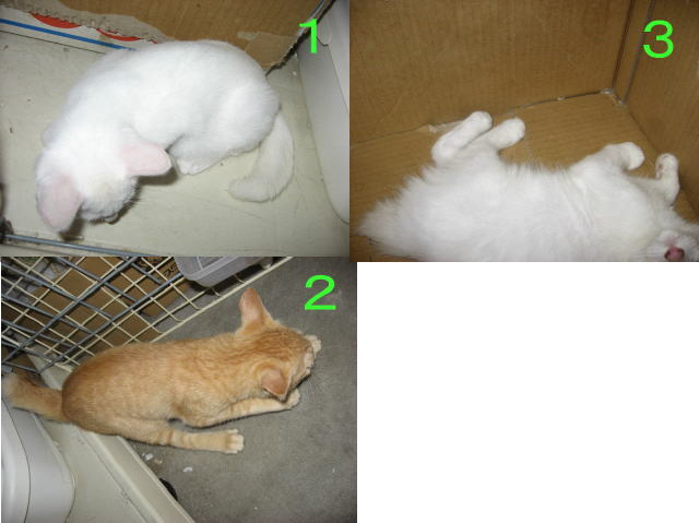 またまたやっちゃいま~す。新入り3子にゃんこクイズです。1・2・3の画像に、目の色、名前、性別(A~H)を組み合わせてくださいね。目の色は?A金色BブルーCオッドアイ名前は?DハルE久Fコチャ性別は?GオスHメス答えは1の画像に目の色?名前?性別?A~Hの組み合わせ2の画像に目の色?名前?性別?A~Hの組み合わせ3の画像に目の色?名前?性別?A~Hの組み合わせ例題としてですが。。。分かりやすいところでは・・・。2はAとFと○(性別は考えてね。^^)締め切りは8月13日午前11時59分です。(お昼前です。)ご参加、お待ちしてま~~す。(*・.・)ノ ヨロシクニャン・:*:・゜'★.。・:*:・゜'☆♪10日は~~最低気温24.9℃最高気温36.7℃朝から晴れたり曇ったり~~。今日も気温がグングン上がり、県内一の気温で、猛暑日~~。いつまで続く、猛暑日。。。12日間続いてる~。暑すぎて、お昼前からエアコン点けてたよ~。日中の暑さ、本当に暑すぎ~~。暑さがきついです。様子見(=^-^=)達は、ふく♀ホワイト♂ボク♂の3にゃん毎日の飲み薬(=^-^=)達は、ふく♀ホワイト♂ボク♂の3にゃん3にゃんの薬は、缶詰に混ぜてます。まだまだ手がかかってます。申し訳ないですが、暫くは、コメントへのお返事は無理みたいです。