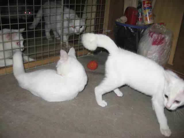 虎視眈々とボールを狙ってたハル♀コチャ♂の隙を見て、ボールを捕ったぞぉぉぉ~~。^^ボールを口に咥えているのはハル♀後ろで見てるのはコチャ♂捕ったぞぉぉぉ~のポーズ?してるハル♀ボールで遊んでるハル♀後ろのコチャ♀に気がついて、ハル♀は、ボールを咥えて移動しようとしてるのかな?30日は~~最低気温21.5℃最高気温27.0℃朝から薄暗い曇り空。涼しい一日になりました。様子見(=^-^=)達は、ふく♀ホワイト♂ボク♂の3にゃん毎日の飲み薬(=^-^=)達は、ふく♀ホワイト♂ボク♂の3にゃん3にゃんの薬は、缶詰に混ぜてます。まだまだ手がかかってます。申し訳ないですが、暫くは、コメントへのお返事は無理みたいです。