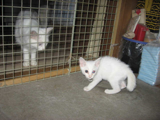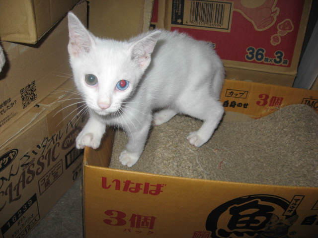 保護されたのは~~僕達のママにゃんこが7月11日に車に轢かれて亡くなって。。。まだ生後2ヶ月だったから、生き延びるのは難しいかも~と言うことで。。。父ちゃんと母ちゃんが相談して、保護しようと言うことになった。と、言っても、殆ど母ちゃん一人で捕まえたんだけど・・・。ママにゃんこが亡くなってから、フードを食べてる形跡はあれど、姿が見えなかった3にゃんこ。2~3日して鳴き声が聞こえ、夜に姿を出すように。でも、警戒してるから、庭に出ると、即、姿を消して~~の、繰り返し。その後、外に置いてる東側のスチール棚や西側の椅子の上から、部屋の中を見るようになるけど、窓に近づくと逃げる~の繰り返し。でも、部屋の中にいる白にゃんこが窓に近づくと、ママにゃんこと思うのか、近寄ってきたり、網戸に爪を入れて、登ってきたり。で、東側の網戸を少し開けて、外から入れるようにしてたけど、中々、入ってこない~。7月31日のお昼前にコチャが、続いてハルが、おそるおそる警戒しながら入ってきたので、網戸を閉めようとしたら、コチャは逃げたけど、ハル♀は捕まえた。8月1日お昼前に、コチャ♂がもう一度入ってきたので、網戸閉め、窓を締めて捕まえた。最後に残った久(きゅう)♂が、一番てこずった!8月1日のお昼に捕まえようと庭に出たけど、姿を見ると逃げる~の繰り返し。お昼は暑くて、捕まえるのを諦めた!夕方5時過ぎから、蚊取り線香2つ点け、エサを持って、出てくるのを待った。朝からご飯を食べさせてないので、エサに釣られて出てくるけど、近寄っては逃げるの繰り返し。1時間余り待って、やっとエサを食べに来た所を捕まえた。けど、大暴れ~~。左手の皮手袋で、首ねっこを押さえ、素手の右手は背中を押さえ、少し厚目のズボン穿いてたので、お腹の所で押さえ込み、用意してた篭に押し込んだ!僕、剛♂でちゅ。僕は7月2日に捕まってたでちゅ。僕、剛♂と上の久(きゅう)♂は、同じオッドアイだけど、左右の目の色が逆でちゅよ。そうそう母たんが、久(きゅう)♂は9にゃんこ目のオッドアイだから、「九」(きゅう)にしようかなぁ~なんて、独り言言ってたでちゅ。14日は~~最低気温22.2℃最高気温33.5℃朝はヒンヤリ涼しかった。朝から晴れ~~。日中はグングン気温も上がったけど、風がヒンヤリしてたので、東西南北の窓を全開して扇風機回したら過ごせたョ。様子見(=^-^=)達は、ふく♀ホワイト♂ボク♂の3にゃん毎日の飲み薬(=^-^=)達は、ふく♀ホワイト♂ボク♂の3にゃん3にゃんの薬は、缶詰に混ぜてます。まだまだ手がかかってます。申し訳ないですが、暫くは、コメントへのお返事は無理みたいです。