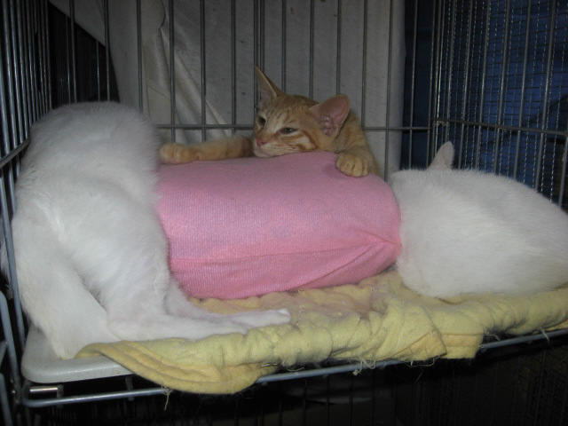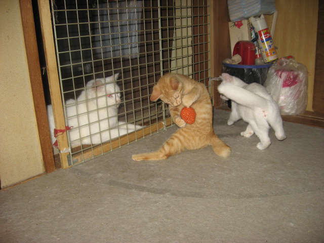 毎日母ちゃんの部屋で、子にゃんこたちは大暴れにゃ~。今日は、ボール遊びしてるにゃ~。網越しに見てるのは、天♂兄ちゃん~。21日は~~最低気温22.8℃最高気温30.4℃朝から、晴れ間も覗く、雲の多い空模様。風もあって、過ごしやすい一日でした。夜になって:::( ^^)T ::: 雨だぁ~。午後9時過ぎから雨がシトシトと降ってきた~。様子見(=^-^=)達は、ふく♀ホワイト♂ボク♂の3にゃん毎日の飲み薬(=^-^=)達は、ふく♀ホワイト♂ボク♂の3にゃん3にゃんの薬は、缶詰に混ぜてます。まだまだ手がかかってます。申し訳ないですが、暫くは、コメントへのお返事は無理みたいです。