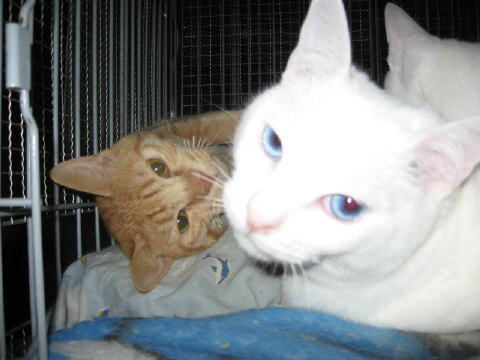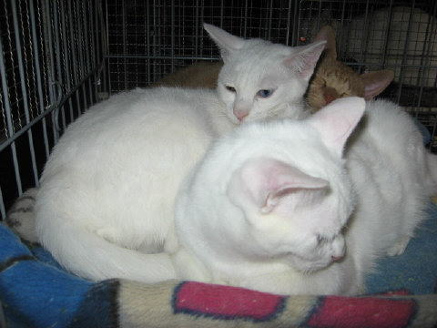 マリ♀アキ♀姉妹は、2013年4月生まれ。去年12月に、びっこ引いてたレオ♂を保護して。。。レオ♂は2013年10月生まれ。同じ母猫から生まれてるから、月は違うけど、同い年の姉弟だよね。でも、姉弟とは思ってないだろうなぁ~。レオ♂が生まれる前から、マリ♀アキ♀姉妹は、もう保護して家の中にいたから~。アキ♀ロンボーの下でマリ♀ロンボーの上でケージの中で、左はアキ♀右にマリ♀レオ♂母ちゃんに甘えてる~。ケージの下でレオ♂今日11日は鏡開き~ぜんざい作りました~。ヾ(@⌒¬⌒@)ノ ウマカッタ。お知らせ~1月中には、今年初~~のにゃんこクイズをやりたいなぁ~なんて思ってます。我が家の25にゃんこの紹介は2016年01月05日の日記←25匹の猫達の画像と短い紹介を書いてます。 左上の方にある『ホーム』をクリックして入ると、毎年のにゃんこの紹介も見れますョ。11日は~~最低気温0.2℃最高気温11.3℃朝から晴れたり曇ったり。寒い朝が続いてます。やっぱり寒い冬は、嫌いだなぁ~様子見(=^-^=)達は、ふく♀ホワイト♂ボク♂純♂あい♀の5にゃん猫毎日の飲み薬(=^-^=)達は、ふく♀あい♀剛♂ハル♀の4にゃん猫ふく♀あい♀の薬は、缶詰に混ぜてます。剛♂ハル♀はシリンジで飲ませてます。まだまだ手がかかってます。申し訳ないですが、暫くは、コメントへのお返事は無理みたいです。
