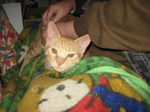 僕、レオ♂です。去年12月11日にびっこを引いて、おしっこをしてる所に、上から篭が下りてきて、捕まった!かかとの関節の所に傷があって、それが化膿してた。(治るまで、少し時間がかかったョ。)麻酔して、去勢手術した時に、ちゃんと処置して貰い、助かりました。母ちゃん大好き~。右後ろ足、剃られた毛は、少しだけど、生えてきてる~。父ちゃんの部屋で、母ちゃんと遊んでます。捕まった当時には出てなかった回虫!回虫が出たので、1月6日にプロフェンダースポットを滴下!3~4日は虫がでてなかったけど、その後たくさん出て次の日からは少し出てた。昨日、今日は虫は出てない。次回は20日に滴下予定だけど・・・。又、回虫が出ると、2週間後の滴下になるなぁ~。母ちゃん曰く、大きくなった分、回虫がたくさんいるのではないかなぁ~。もしかして次回の滴下だけじゃ無理かも~。20日に滴下して、2週間後にもやらないとけないかも~~と、言ってます。なので、回虫がいなくなるまで、みんにゃと合流させてくれないです。お知らせ~1月中には、今年初~~のにゃんこクイズをやりたいなぁ~なんて思ってます。我が家の25にゃんこの紹介は2016年01月05日の日記←25匹の猫達の画像と短い紹介を書いてます。 左上の方にある『ホーム』をクリックして入ると、毎年のにゃんこの紹介も見れますョ。15日は~~最低気温マイナス2.0℃最高気温8.8℃今日も庭に出たら、洗面器に少し厚めの氷が張ってたよ~。午前中は曇り空。午後から、晴れ間も覗く、雲の多い空模様。朝冷え込んでたら、スッキリ晴れてほしいなぁ~。曇り空が多いと、部屋の中もヒンヤリしてて寒いんだよね。様子見(=^-^=)達は、ふく♀ホワイト♂ボク♂純♂あい♀の5にゃん猫毎日の飲み薬(=^-^=)達は、ふく♀あい♀剛♂ハル♀の4にゃん猫ふく♀あい♀の薬は、缶詰に混ぜてます。剛♂ハル♀はシリンジで飲ませてます。まだまだ手がかかってます。申し訳ないですが、暫くは、コメントへのお返事は無理みたいです。