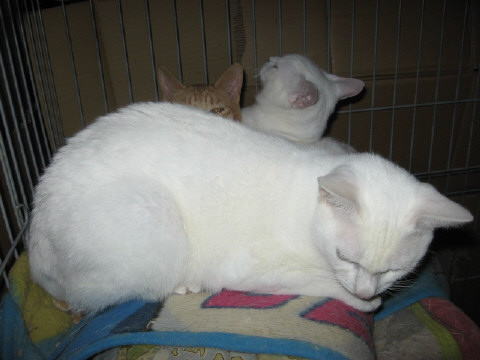 左の座布団の上で寅♂右の毛布の上であい♀それぞれの場所で寝てたよ~独り用の猫ベットの中で、左にエル♀右は寅♂寅が独りで寝てたところへ、エルがやってきて寝たよ~ケージの中で、左はサチ♀右にふく♀仲良く、お昼寝中~31日は~~最低気温0.2℃最高気温10.8℃朝からどんよりとした曇り空。午後からは、小雨もパラついてたよ~。鬱陶しい空模様の一日でした。我が家の25にゃんこの紹介は2016年01月05日の日記←25匹の猫達の画像と短い紹介を書いてます。 左上の方にある『ホーム』をクリックして入ると、毎年のにゃんこの紹介も見れますョ。様子見(=^-^=)達は、ふく♀ホワイト♂ボク♂純♂あい♀マーブル♂の6にゃん猫毎日の飲み薬(=^-^=)達は、ふく♀あい♀剛♂ハル♀マーブル♂の5にゃん猫ふく♀あい♀の薬は、缶詰に混ぜてます。剛♂ハル♀マーブル♂はシリンジで飲ませてます。まだまだ手がかかってます。申し訳ないですが、暫くは、コメントへのお返事は無理みたいです。