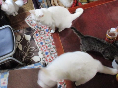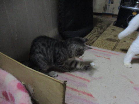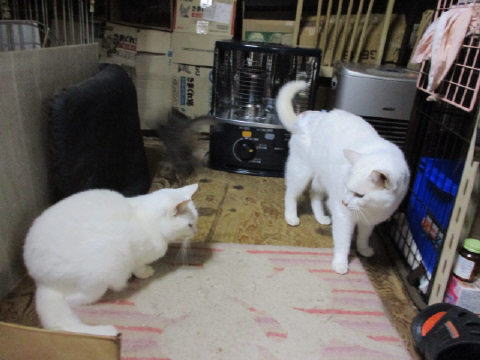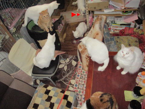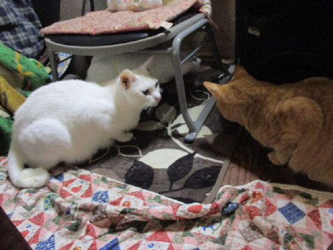 ユキ♀が何かを見つけて?遊んでる~。ダンボールの切れ端?チラシの切れ端?で遊んでる~。それを眺めてる大きなにゃんこたち~。最後は、切れ端を咥えて、ユキ♀は←左の方へ走って行ったよ~。それを目で追ってる大きなにゃんこたち~。17日は~~最低気温5.7℃最高気温18.3℃朝から、晴れたり曇ったり。日中は、暖かくて過ごしやすかった。様子見(=^-^=)達は、あい♀ボク♂大♂きじ丸♂の4にゃんこ毎日の飲み薬はシリンジで、ボク♂きじ丸♂の2にゃんに飲ませてます。まだまだ手がかかってます。申し訳ないですが、暫くは、コメントへのお返事は無理みたいです。我が家の25にゃんこの紹介は2016年01月05日の日記←25匹の猫達の画像と短い紹介を書いてます。 左上の方にある『ホーム』をクリックして入ると、毎年のにゃんこの紹介も見れますョ。