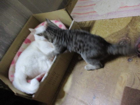末っ子ユキ♀は、まだちいちゃいから、大きなお兄ちゃん、お姉ちゃんは、手加減して遊んでくれるけど、それが分かってないユキ♀は、悪さのし放題~~。やり放題~~。誰彼構わず、飛びかかってますよ~。今は甘やかして、遊んでくれてるけど、大きくなって同じようなことをすれば反撃されるよ~。容赦がないよ~。寝子ベットの中はハル♀飛びかかってるのはユキ♀ロンボーの中はマーブル♂飛びかかってるユキ♀8日は~~最低気温8.2℃最高気温16.2℃朝から、晴れ間も覗く曇り空。午後2時過ぎ頃から、雨がポツポツ降ってきたよ~。その後はシトシト降ってて、午後8時頃には雨は上がったみたい。日中は寒かった。様子見(=^-^=)達は、あい♀ボク♂大♂きじ丸♂の4にゃんこ毎日の飲み薬はシリンジで、ボク♂きじ丸♂の2にゃんに飲ませてます。まだまだ手がかかってます。申し訳ないですが、暫くは、コメントへのお返事は無理みたいです。我が家の25にゃんこの紹介は2016年01月05日の日記←25匹の猫達の画像と短い紹介を書いてます。 左上の方にある『ホーム』をクリックして入ると、毎年のにゃんこの紹介も見れますョ。