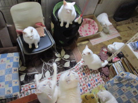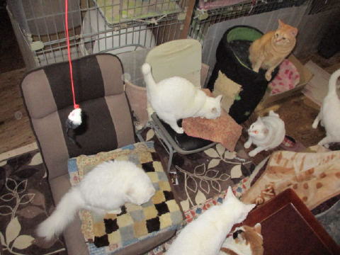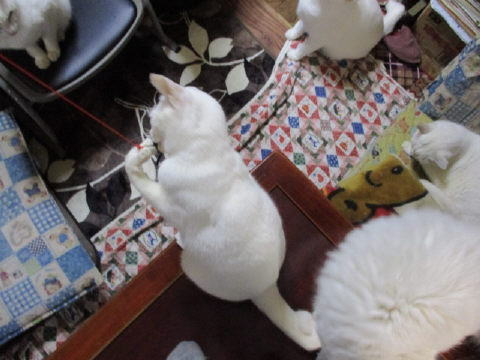 珍しく、ホワイト♂が猫じゃらしで遊んでる~。遊んでたけど、みんにゃがゾロゾロと集まってきたよ~。ホワイト♂は、みんにゃの勢いに負けて、少し離れた椅子の上から見てたョ。14日は~~最低気温10.8℃最高気温14.6℃朝から、雨が降ったり止んだり。午後から雨がシトシトと降ってきた~。夕方からは、雨はザーザー降ったり、小降りになったりして、降り続いてる。夕方から雷注意報も出てる。肌寒い一日になりました。様子見(=^-^=)達は、あい♀ボク♂大♂きじ丸♂の4にゃんこ毎日の飲み薬はシリンジで、ボク♂きじ丸♂の2にゃんに飲ませてます。まだまだ手がかかってます。申し訳ないですが、暫くは、コメントへのお返事は無理みたいです。我が家の25にゃんこの紹介は2016年01月05日の日記←25匹の猫達の画像と短い紹介を書いてます。 左上の方にある『ホーム』をクリックして入ると、毎年のにゃんこの紹介も見れますョ。
