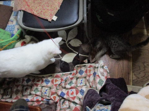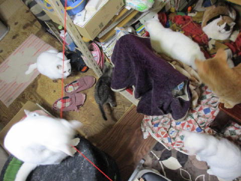ユキ♀は、大きいお兄ちゃんお姉ちゃんの間に入って、ネズミじゃらしを捕ろうと頑張ってま~~す。ユキ♀って、小さな体で、大きな態度かも~~。^^(ユキ♀は、わかりにくいと思って、矢印してま~す。)30日は~~最低気温4.0℃最高気温11.9℃朝から、曇り空。日中は、気温も上がらず寒い一日でした。様子見(=^-^=)達は、あい♀ボク♂大♂きじ丸♂の4にゃんこ毎日の飲み薬はシリンジで、ボク♂きじ丸♂の2にゃんに飲ませてます。まだまだ手がかかってます。申し訳ないですが、暫くは、コメントへのお返事は無理みたいです。我が家の25にゃんこの紹介は2016年01月05日の日記←25匹の猫達の画像と短い紹介を書いてます。 左上の方にある『ホーム』をクリックして入ると、毎年のにゃんこの紹介も見れますョ。