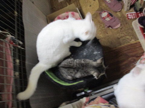 σ(=^‥^=) ワタチ、ユキ♀でちゅ。ここに来て、家族の仲間入りして2ヶ月になったでちゅ。生後3ヶ月を過ぎたでちゅ。大きくなったよ~と母ちゃんが言ってるでちゅ。悪さも一人前だぁ~と父ちゃんが言ってるでちゅ。チビッ子ギャングの仲間入りしたでちゅョ。ロンボーの上のマーブル♂と横の猫ベットのハル♀と遊んでるユキ♀ロンボーの上で剛♂に押さえ込まれてるユキ♀悪さして母ちゃんに首ねっこを押さえられてるユキ♀ユキ♀ロンボーの上で休憩中かな?ユキ♀ケージを覗いてるのかな?ユキ♀何かをしようとしてるのかな?15日は~~最低気温13.1℃最高気温19.5℃朝から、薄日も射し、小雨もパラつき、雲の多い空模様。風の強く吹く、鬱陶しい空模様の一日でした。様子見(=^-^=)達は、あい♀ボク♂大♂きじ丸♂の4にゃんこ毎日の飲み薬はシリンジで、ボク♂きじ丸♂の2にゃんに飲ませてます。まだまだ手がかかってます。申し訳ないですが、暫くは、コメントへのお返事は無理みたいです。我が家の25にゃんこの紹介は2016年01月05日の日記←25匹の猫達の画像と短い紹介を書いてます。 左上の方にある『ホーム』をクリックして入ると、毎年のにゃんこの紹介も見れますョ。