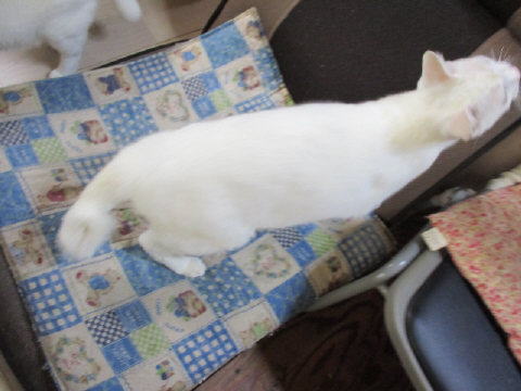 ユキ♀は、猫じゃらしを追いかけて、 o(^‥^=o)~アッチコッチ ~(o=^‥^)o と、移動中!ユキ♀は、まだちいちゃいねぇ~。今月11日で3ヶ月。アチコチ動き回るのはいいけど、踏まれないようにねぇ~。潰されないようにねぇ~。もうすぐσ(=^‥^=)ワタシの誕生日!来週早々には誕生日。今年も誕生日が来る前から、色々と買ってま~~す。^^左下は、猫柄ひざ掛け毛布。左上は猫柄座布団。(PC前の座椅子に座るので、使おうと思って買いました。)右下は、猫耳付きリュックサック(去年は黒を買ったので、今年は色違いのこげ茶を買いました。)右上は、ふくろう柄のリュックサック5日は~~最低気温6.5℃最高気温20.1℃朝から、晴れたり曇ったり。朝は冷え冷え~~。日中は、気温も上がり、暖かかった~。朝晩と日中の気温差が激しいので、にゃんこも私も体調には気をつけないと~。様子見(=^-^=)達は、あい♀ボク♂大♂きじ丸♂の4にゃんこ毎日の飲み薬はシリンジで、ボク♂きじ丸♂の2にゃんに飲ませてます。まだまだ手がかかってます。申し訳ないですが、暫くは、コメントへのお返事は無理みたいです。我が家の25にゃんこの紹介は2016年01月05日の日記←25匹の猫達の画像と短い紹介を書いてます。 左上の方にある『ホーム』をクリックして入ると、毎年のにゃんこの紹介も見れますョ。