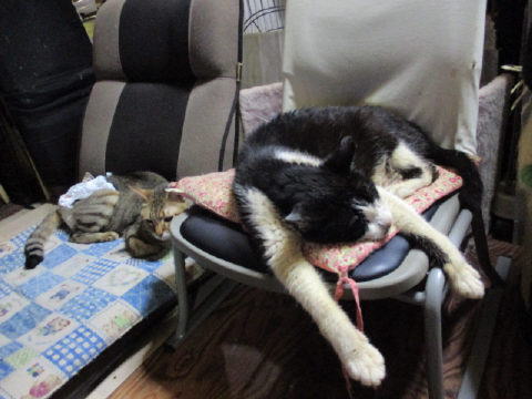 寝子~~よく寝てますよ~これから寒くなれば、寝子団子が見れるかにゃ~?でも、寝てるにゃんこって、シニアにゃんこばっかりだぁ~。^^まぁ、若いのは、元気が有り余って走り回ってるよねぇ~。^^あい♀母ちゃんの座椅子の上でサチ♀低い椅子の上で手前はミコ♀後ろにボク♂ボク♂座布団に寄りかかってるのかな?寅♂猫ベットの中で21日は~~最低気温9.9℃最高気温16.4℃朝から曇り空。時折、薄日も射すけど、雲の多い空模様。肌寒い日中でした。午後9時頃から:::( ^^)T ::: 雨だぁ~。シトシトと降ってきたよ~。様子見(=^-^=)達は、あい♀ボク♂大♂きじ丸♂の4にゃんこ毎日の飲み薬はシリンジで、ボク♂きじ丸♂の2にゃんに飲ませてます。まだまだ手がかかってます。申し訳ないですが、暫くは、コメントへのお返事は無理みたいです。我が家の25にゃんこの紹介は2016年01月05日の日記←25匹の猫達の画像と短い紹介を書いてます。 左上の方にある『ホーム』をクリックして入ると、毎年のにゃんこの紹介も見れますョ。