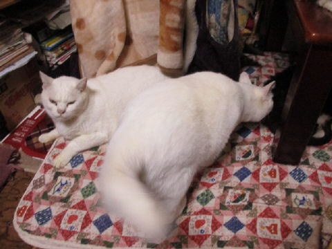 毛布の上で、の~~んびりしてるにゃ~。毛布は、暖かいにゃ~。母ちゃんの毛布の上では~エル♀ゴロゴロしてる将♂ふみふみしようとしてるのかにゃ~?ユキ♀捕まってるにゃ~父ちゃんの膝の上の毛布で~ナツ♀眠そう~ホワイト♂カメラは嫌いだ~と少し下を向いたにゃ~マーブル♂逃げようとして捕まってるのかにゃ~?25日は~~最低気温2.8℃最高気温14.8℃朝から、晴れたり曇ったり。朝は、冷え込みがきつかった。{{ (>_