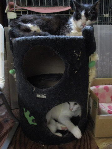 ロンボー使って遊んでるにゃ~。ロンボーの上に剛♂中はマーブル♂前にユキ♀横の猫ベットの中は寅♂は寝子。その横の天♂は、ロンボーの方を見てるけど、上がろうと思ってたのかな?ロンボーの上に上がったユキ♀剛♂とマーブル♂は何を見てるの~?ユキ♀とマーブル♂は何を見てるの~?剛♂は少し下向いてるね。ユキ♀が剛♂にかかっていったよ~。マーブル♂は上が気になってるのかな?剛♂に反撃されてるユキ♀マーブル♂は出ようとしてるのかな?我関せずで寝子の寅♂23日は~~最低気温9.2℃最高気温14.2℃朝から、雲り空。風が冷え冷え~~。気温も下がり、すんご~~く寒い一日になってます。様子見(=^-^=)達は、あい♀ボク♂大♂きじ丸♂の4にゃんこ毎日の飲み薬はシリンジで、ボク♂きじ丸♂の2にゃんに飲ませてます。まだまだ手がかかってます。申し訳ないですが、暫くは、コメントへのお返事は無理みたいです。我が家の25にゃんこの紹介は2016年01月05日の日記←25匹の猫達の画像と短い紹介を書いてます。 左上の方にある『ホーム』をクリックして入ると、毎年のにゃんこの紹介も見れますョ。