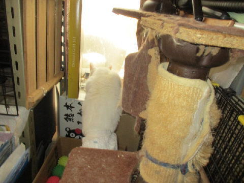 西側のスチール棚やタワーから、何を見てるのかにゃ~?蛾や虫が飛んできてるの~?と、思ってたら。。。大♂スチール棚の一番上の奥から華♀スチール棚から少し顔を出してボク♂タワーの一段目奥からユキ♀スチール棚の二段目からタワーの一段目奥は、入れ替わってハル♀その上に将♂みんにゃが見てたのは、赤い矢印の所にいる白いにゃんこ~外に出してる椅子の上で、寝てるみたい。欲しいなぁ~と思って、買っちゃいました。今まで使ってるより、高さも幅も少し短いですが、両横に、ポケットが付いてるので買っちゃいました。リュックサックです。出かける時や買い物の時、両手が使えるので便利で、リュックサックを利用してます。^^13日は~~最低気温10.5℃最高気温25.7℃朝から晴れ~~。朝の気温が今日も低かった。気温の低い朝は、1~2時間ファンヒーターを点けてます。日中は過ごしやすかったです。様子見(=^-^=)達は、あい♀ボク♂大♂きじ丸♂の4にゃんこ毎日の飲み薬はシリンジで、ボク♂きじ丸♂の2にゃんに飲ませてます。まだまだ手がかかってます。申し訳ないですが、暫くは、コメントへのお返事は無理みたいです我が家の25にゃんこの紹介は2016年01月05日の日記←25匹の猫達の画像と短い紹介を書いてます。 左上の方にある『ホーム』をクリックして入ると、毎年のにゃんこの紹介も見れますョ。