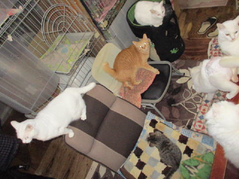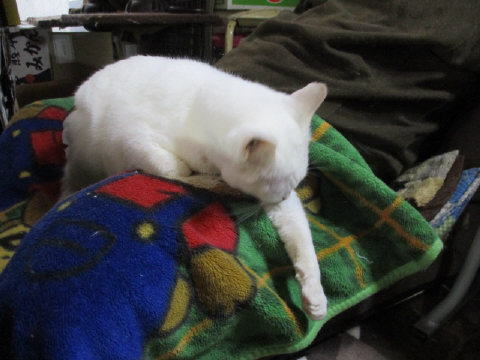 寝てるのか?起きてるのか?わからないにゃんこ~雄♂父ちゃんの膝の上で華♀PC前の椅子に座ってる父ちゃんの膝の上で寝てると思うけど・・・ホワイト♂父ちゃんの膝の間でナツ♀ロンボーの上で寅♂父ちゃんの座布団の上で12日は~~最低気温10.8℃最高気温23.5℃朝から晴れたり曇ったり。朝の気温が低かった。そのせいなのか?部屋の中はヒンヤリ~寒かった。風が冷たい、寒い一日でした。様子見(=^-^=)達は、あい♀ボク♂大♂きじ丸♂の4にゃんこ毎日の飲み薬はシリンジで、ボク♂きじ丸♂の2にゃんに飲ませてます。まだまだ手がかかってます。申し訳ないですが、暫くは、コメントへのお返事は無理みたいです我が家の25にゃんこの紹介は2016年01月05日の日記←25匹の猫達の画像と短い紹介を書いてます。 左上の方にある『ホーム』をクリックして入ると、毎年のにゃんこの紹介も見れますョ。