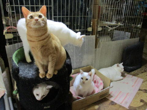 天気が良くなると、晴れてると、どこからか大量の蛾?が庭に集まってる~。それを見ようと、窓を開けると、みんにゃが集まってくるにゃ~でも、なぜか上の段より、下の段に来るにゃんこが多いんだよねぇ~。上の段では~ホワイト♂下の段では~手前から剛♂ハル♀ミコ♀一番奥の健♂は、押し出されたのか?向きを変えて降りようとしてる手前から剛♂ハル♀ミコ♀手前から剛♂ハル♀全にゃんこが入れ替わったのかな?手前は誰?この毛並みだとアキ♀ナツ♀レオ♂誰にゃんだろうなぁ~?中はコチャ♂奥は誰?白猫しかわからない~8日は~~最低気温17.4℃最高気温26.6℃朝から晴れ~~。過ごしやすい日中になりました。夕方から、少し風がヒンヤリ~涼しい風が吹いてきたョ。様子見(=^-^=)達は、あい♀ボク♂大♂きじ丸♂の4にゃんこ毎日の飲み薬はシリンジで、ボク♂きじ丸♂の2にゃんに飲ませてます。まだまだ手がかかってます。申し訳ないですが、暫くは、コメントへのお返事は無理みたいです我が家の25にゃんこの紹介は2016年01月05日の日記←25匹の猫達の画像と短い紹介を書いてます。 左上の方にある『ホーム』をクリックして入ると、毎年のにゃんこの紹介も見れますョ。