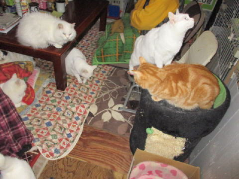 ファンヒーターの前は暖かい~一番乗りのユキ♀次にマーブル♂がやってきた~剛♂もやってきたよ~マーブル♂がいなくなって、ユキ♀と剛♂だけ~で、ファンヒーターを独占だぁ~。^^昨日、外に出してたカニサボテンに金のなる木、アロエを玄関や勝手口に入れたよ~。勝手口にパイプを組立てて入れたら、勝手口が狭くなっちゃいました。一番上とその下には、鉢植えを。二段目には、箱の中に猫ベットを入れて、にゃんこたちが使えるようにしてます。26日は~~最低気温0.9℃最高気温9.6℃朝から、曇り空。午後5時頃から雨がシトシトと降って、1時間余りで止んだ。今日も、寒い一日になりました。朝、エアコンで部屋を暖めて、それからファンヒーター点けてるョ。様子見(=^-^=)達は、あい♀ボク♂大♂きじ丸♂ナツ♀エル♀の6にゃんこ毎日の飲み薬はシリンジで、ボク♂きじ丸♂ナツ♀エル♀の4にゃんこに飲ませてます。まだまだ手がかかってます。申し訳ないですが、暫くは、コメントへのお返事は無理みたいです我が家が25にゃんこだった時の紹介は2016年01月05日の日記←25匹の猫達の画像と短い紹介を書いてます。 左上の方にある『ホーム』をクリックして入ると、毎年のにゃんこの紹介も見れますョ。