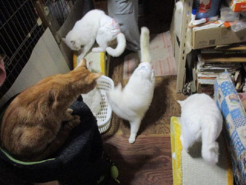 奥のハル♀と手前の剛♂がおもちゃに手を突っ込んで遊んでま~す。中に入ってる鈴入りボールは捕れないけど、捕ろうと手を突っ込んで遊んでますよ~。23日は~~最低気温4.1℃最高気温11.9℃朝から、晴れ間も覗く、雲の多い空模様。風はヒンヤリ~寒い一日になりました。朝、エアコンで部屋を暖めて、それからファンヒーター点けてるョ。様子見(=^-^=)達は、あい♀ボク♂大♂きじ丸♂ナツ♀エル♀の6にゃんこ毎日の飲み薬はシリンジで、ボク♂きじ丸♂ナツ♀エル♀の4にゃんこに飲ませてます。まだまだ手がかかってます。申し訳ないですが、暫くは、コメントへのお返事は無理みたいです我が家が25にゃんこだった時の紹介は2016年01月05日の日記←25匹の猫達の画像と短い紹介を書いてます。 左上の方にある『ホーム』をクリックして入ると、毎年のにゃんこの紹介も見れますョ。