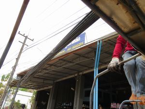 店の従業員が鉄材の束をソンテオの屋根に載せて縛りつけ始めました。