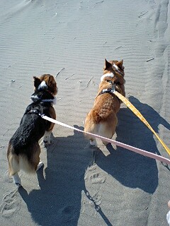 あったかいし、いい天気!・・・となると、行き先は一つ。もちろん、海!今日はパパが会社に行ってしまったので・・・普段なら、なかなか許してもらえないことを、やっちゃいました!海に着いた途端、波打ち際へ直行。で・・・そのままバシャバシャとひたすら走る~~~♪波が寄せてくるたびに、ちょこっとビビッて砂浜に逃げるかい&らにを笑いながら、息が切れるまで走りました。いつもならガウガウ散歩になるかい&らにも、海にくればそんなことをすっかり忘れて仲良し☆やっぱり開放感が違うのかな。3人でびしょびしょになりながら、すっかり楽しみました。疲れきって寄り添って歩くかい&らに。ほんとはもっとぴったりくっついてたのに、携帯出したら離れちゃった。。。
