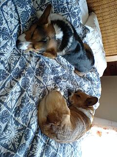 さっきまで、なぜかベッドの上で喧嘩していたのですが、次の瞬間にはこの通り。喧嘩疲れか、本当は仲良しだからか・・・。飼い主も和むひとときでした☆