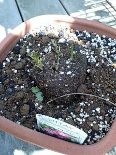 Nちゃん、これ見てわかる?先日、買ってきたミニバラの苗。シンプルな花姿と微妙な色合いがものすごく気に入ったのに・・・らに、お腹壊さなきゃいいけど。
