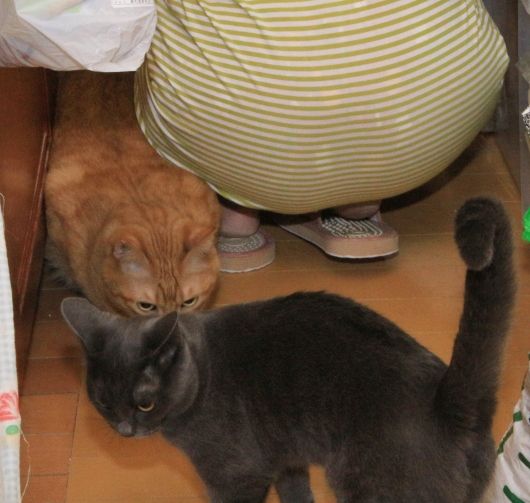 ロンが、無謀にも、お母さんの横をすり抜けようとしています。
