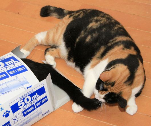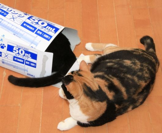 シリンジの空き箱の中から黒猫の困ったような視線を感じます。