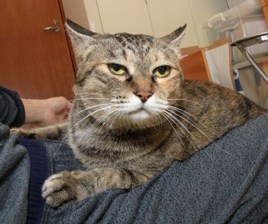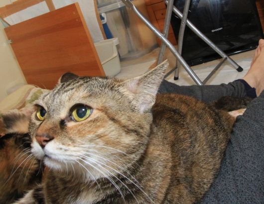 サキのご機嫌を直す為、膝の上で、撫でてあげますが、この顔です。