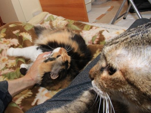 実は、サキを撫でていると、いつも、モモも横に来て、撫でてくれと、せがみます。
