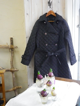 私物でリバティのキルティングではラベン風のジャケットとベストが今季も活躍中です。どちらもカジュアルなので次はシックなデザインが欲しいと思っていました。パターンはクルールさんのトレンチコートで、本来は薄手コート用でしたがキルティング生地でもなんとか作れないかなぁと玉砕覚悟で(!)挑みました。(とはいっても3.5m購入して失敗したら当分立ち直れないところでした.笑)キルティングなのを考慮してごわつきそうなポケットはこの際無しに、ベルトはバックル無しのリボンタイプに変更しています。(いつもバックルがあっても留めずに結んでしまうので)生地はグレンジェイドのグレーです。無地に見えるくらいのツートンを探していた矢先、C&Sさんから見透かされていたんじゃないかと思うくらいのタイミングで出ました。黒地にグレーの模様で裏地はグレーのナイロンです。襟は一番上まで留めても。前の重なりがたっぷりで、このタイプの開きには見返しが付く為前部分は計4枚の生地が重なっています。ちょっと厚みが気にならなくはありませんが、風が通らずチャリ族には有難し。袖口はタブ付き。あくまでトレンチなのでこれは面倒でも外せません。後ろ裾にはボックスプリーツがあります。キルティングで作れるか一番気を揉んだ部分でしたがステッチを利かせてなんとか。暖かい上に軽く、ちゃんとしたデザインなので場所を選ばず長く着られそうです。最後まで読んで下さった方↓クリックして頂けると嬉しいです*
