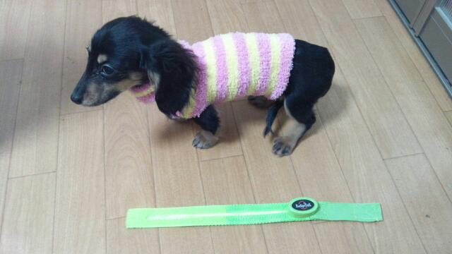 画像の犬はK・ダックス。小さすぎて胴輪になりましたが、ハーネスと組み合わせてずり落ちないようにしています。