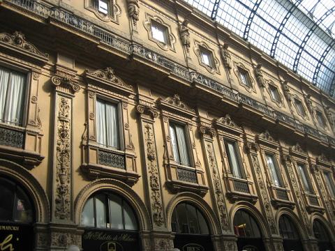 ミラノのガッレリア。いつもにぎやかな光景ばかりですが、今日は角度を変えて。歩く目線で見ると、ブランドショップやカフェ、サッカーグッズやお土産の店まで、色んな顔がありますが、ふと見上げると、昔日の、貴族のお屋敷だったころを髣髴とさせるようなたたずまい。・・・周りの喧騒も、いつのまにか遠くになるような錯覚さえ感じちゃいます。以前はガッレリアの中心で、四方のお店を見てみましたが、今日はせっかく見上げたところなので、ガッレリアの優美なフレスコ画を見てみたいと思います♪ ガッレリアの中央、四つの角には、東西南北を象徴する四大陸のフレスコ画が描かれています。イタリアから見た東のアジア、西のアメリカ、南のアフリカ、そして北のヨーロッパ。それぞれ東西南北の角に合わせて描かれているとのことでしたので、プラダのショップの上がヨーロッパを表している・・・のだと思います(←自信ないのですが~・・・汗) ・・・ってことは、プラダの反対側、ヴィトンのお店の上は、アジアなのかしら~?誰か正解知っていたら教えてください~・・・四大陸なのですから、あとの2大陸も、って思うでしょ?思いますよねぇ~。。。・・・・スミマセン、オオボケな写真でお見せすることができません~~ので、また今度、近いうちに写真撮りに行ってきます(笑)ガッレリアには何度も足を運んでいるクセに、ちゃんと見るべきところ、見ていないものなんですネ~。次回こそ必ず、四大陸制覇したいと思います~。