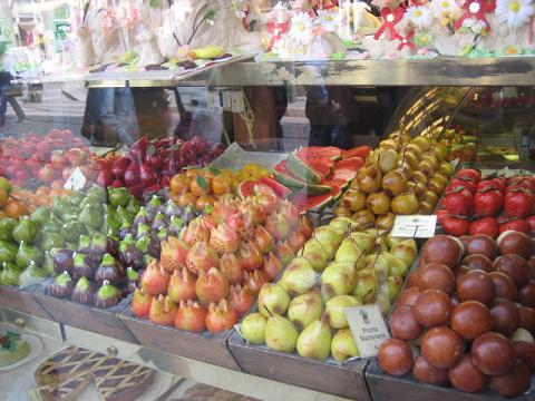 ミラノのお菓子屋さんのウインドウ~。以前紹介しました、例のカッサータを売っていたお店です。たぶん砂糖菓子なんでしょうね、けっこうリアルな果物シリーズですリアルなんだけど、スイカとマンダリーナ、りんごに洋ナシ、・・・?。。。。あとは、ナンだろう~こういうのって、日常的に売られているものなのかしら?なんとなく、お盆に仏様に備えるお菓子を想像してしまった私。・・・復活祭間近だったから、そういう伝統菓子なのかしら。。。あんまり、がつがつ食べるモノでもなさそうですよね(笑)