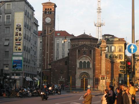夕日を浴びる、サン・バビラ教会。サン・バビラといえば、ミラノの中心部、いわゆるブランドショッピングの起点となる場所で、地下鉄の駅もあり、ガイドブックにも大きくその名が載っています。でも、肝心のサン・バビラ教会は、というと、都会の喧騒に囲まれてちょっと窮屈そうですネ。サン・バビラ教会の起源は5世紀にまでさかのぼるといわれ、サンタンブロージョやサン・ロレンツォといった有名どころ(?)に負けないほどの由緒ある教会。・・・建物自体は19世紀末から20世紀初頭にかけて再建されたものだそうですが、日々変化していくミラノの風景で、ここだけポツン、と取り残された感じがしてしまうのは、私だけでしょうか・・・?都会の宿命なのかもしれませんが、ビルの谷間に肩をすくめるようにしてたたずむ教会をみていると、ちょっと寂しい気もします。ミラノという町は、こういう場所が多くて、モダンなビルのそばにひっそりと、こういう歴史のある教会が隠れていたりします。町全体が宝箱のような、イタリアらしい風景とはちょっと違うけれど、これがミラノ風、なのかもしれませんネ~。