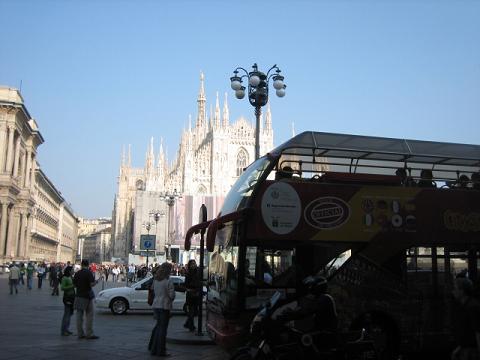 ドゥオモ広場で見かけた観光バス 2階建ての大型バスで、車体にはミラノの観光名所のイラストと、各国語で案内が聞けます、という案内表示。イタリアの主要観光都市では最近このバスをよく見かけますヨネ。もちろん、こういう定期観光バスは世界中ドコでもあるんだけど、英語やフランス語をはじめ、日本語でも音声ガイドが聞けるなんて、なんだかスゴイですネ。ちなみにこの観光バスは1日フリーパスとして、何度でも、ドコからでも乗り降り自由で大人一人20ユーロだそうです。20ユーロ分、うまく乗りこなせたら多分、ミラノの達人かも~(笑)