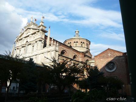 ミラノの中心地、ドゥオモ広場から、15番のトラムに乗ってサンタ・マリア・プレッソ・サン・チェルソ教会へやってきました~。15番のトラムの路線は、サン・バビラからイタリア大通りを通ってティチネーゼ門へ、そこからナヴィリオ運河と平行してミラノの郊外へと走っています。チェントロからティチネーゼ門やナヴィリオ界隈へ出かけるときは、この15番か、もしくは3番のトラムに乗っていくと便利ですが、いつも3番を利用しているので、つねづね訪れたいとおもいつつ、なかなか来ることが出来ずにいたトコロです。白い大理石で作られた壮麗なファサードと、角度を変えるとレンガ造りのつつましいたたずまいが印象的な教会です。16世紀の初頭に建てられた教会で、見所は教会内のフレスコ画。 サンタ・マリア・プレッソ・サン・チェルソという名前は、「地球の歩き方」にも載っているのですが、実はここでちょっとギモン。ミラノで買った地図には、この教会に「S.M.d.Miracoli」、サンタ・マリア・ディ・ミラーコリ、と書いてあるのです。よく良く見ると、その近くに小さく、San Celso(サン・チェルソ)って書いてもある。実際には二つの教会が隣り合って立っているので、どちらかがミラーコリで、どちらかがサン・チェルソなんだと思うのですが、この表記を発見したのが帰国後でしたので、真相は定かではアリマセン。・・・でも、まぁきっと「地球の歩き方」のほうが正しいんだろうな、って思ってしまうのは何故かしら~ ・・・イタリアの空は、青いなぁ~この周辺は昔ながらの石造りのどっしりした建物が立ち並んでいるところなので、この白亜のファサードを見上げると、そこだけ、一枚の絵画、絵葉書のように見えるのです。教会が面している通りは「イタリア大通り」。名前はスゴイけど、実はそんなに道幅も広くないし、トラムの線路があると余計に狭く感じる通りです。・・・きっと中世の時代にはそれでも大きい通りだったんでしょうね。ところどころ、名残というか、石畳の道になっています。幅は狭くとも、大通りですから、それでもクルマなど、交通量は多いので、地元の子供達が教会前のお庭で元気に遊んでいました♪この教会からですと、ティチネーゼ門までそう遠くないので、その気になればサン・テウストルジョ教会やサン・ロレンツォ教会まで歩いていくことが出来ます。実際、今回は私も歩いてこの3箇所の教会を回ってきましたが、普段トラムや車で通らない路地を歩くことが出来てちょっと楽しかったデス☆ チェントロを起点とするなら、15番のトラムでまずサン・チェルソ教会へ、そのあとサンテウストルジョからサン・ロレンツォを回って、再び帰ってくるルートがいいかも。15番のトラムに乗ったらこの、重そうな表情のカップルを目印に、降りてくださいネ(チェントロから乗ってきたら左側、ティチネーゼから乗ってきたら右側にあります♪この建物の前が停留所なので、わかりやすいですヨ!)