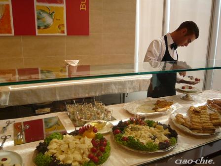 スミマセンね、今日も食べ物の話(笑)。こちらは、ミラノの展示会会場の中にあるバールなんですけど、お仕事の合間にお茶を飲んだり、軽食をとったりできる場所です♪おつまみ系の食べ物が多いのはもう午後だから☆好きなものを注文すると、お兄さんがお皿に取り分けてくれます。このお兄さんがね、とってもマジメで、こんな小さいプチトマトでも、そりゃあもう真剣に盛り付けてくれるの で、手前に山と積んであるのがチーズ注文すると、お皿に山盛りにしてくれるんですヨ♪大好きだから、いつもお願いするんだけど、最初は何も言わずにお皿に盛ってくれたけど、2回目からは「ミエーレ(ハチミツ)、いりますか?」って聞いてくれるようになりました。チーズとハチミツ、とっても相性がいいですよねよくピッツァでも、チーズとハチミツというメニュウがありますが、とろけたチーズも美味しいけど、パルミジャーノのブロックにハチミツをドバッってかけて食べるという、ある意味「贅沢」な食べ方がたまりませんの。。。これって、もう「ドルチェ」、デザートの域なのかしら??でも、ハチミツ添えのチーズを一皿食べた後、さらに口直しにケーキを食べちゃうツワモノもいます。 ・・・ハイ、そのツワモノとはワタクシのことです(笑)。。でもね、展示会で一日中歩き回っていると気づくとランチ抜きで夕方になることもしばしば。食べられるときにしっかりと栄養補給をするのもプロ、だと思うんですよ(なんちゃって~~~)この日のドルチェは、シチリア風カンノーロと、シュークリーム。シュークリームにかかっているパウダーは、チョコかと思ったらエスプレッソ粉。中のクリームもカフェ味でした・・・ハチミツをイタリア語にすると、ミエーレ(Miele)といいますが、よく映画とかで恋人や大切な相手に対して「ハニー」って呼びかけてますよね。あんな感じで、イタリアでは大切な人に対して「ミエーレ」って呼びかけたりします♪同様に、「アモーレ(いとしい人)」とか、「テゾーロ(ワタシの宝物ちゃん)」なんていう呼び方もありますが、私は実はひそかにこの、「ミエーレ」という呼びかけが好き♪ でも、実際に呼ばれたら、やっぱり照れますね。。。