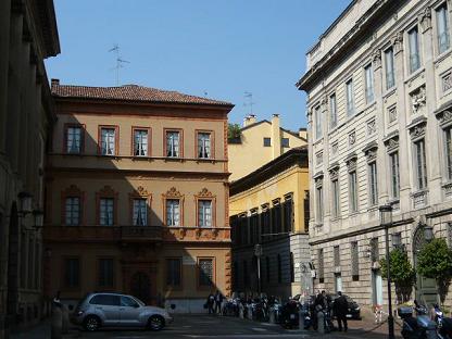 モンツァの旧市庁舎前、ローマ広場から駅のほうへと続く通りがヴィーア・イタリア。ローマ広場を中心とした旧市街エリアは、実は一般に車が入れないようになっているので、町のヒトも、観光客達も、ゆっくりとウィンドウショッピングなどを楽しむことができます。トスカーナの小さな町ではよく、こういう町の仕組みがありますが、車社会イタリアで、あえて一般車をシャットアウト出来てしまうところがなんだかすごいな、っていつも思います。スモッグ警報とか出ると、ミラノなどの大都市でも平気で(?)車両の立ち入りが禁止になったりしますし、町の人たちも慣れたもので文句を言う人もいません。(もっともそういう場合は大体前日にはテレビなどで事前に告知されますが。。)エコロジーについて考えるところはたくさんありますが、こういう有無を言わさぬやりかたも、時には必要なのかも。 そんなモンツァの イタリア通りは、やっぱり昔ながらのたたずまいを残す商店街。食料品から高級ブランドまで、いろんなお店が立ち並んでいますが、ちょっと目線をあげると、こんなお洒落な壁が続く町なんです♪そんな通り沿い、アレンガリオからもすぐ近くなんですが、立ち並ぶ商店と軒を連ねるようにして、レンガ造りの教会が建っています。 その名も、「サンタ・マリア・イン・ストラーダ」。イタリアでは、通り(=ストラーダ)に面した教会って大体前が広場だったりするんですけど、右も左も、お向かいも商店というロケーションで建っている姿がなんとなくほほえましく感じます♪ようやく灯りはじめた町のあかりに照らされて、ばら色に浮かび上がる教会、この色もまた、実にイタリアらしいのであります。。。。