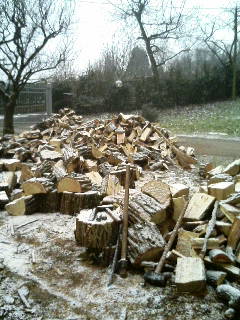 本物の暖炉と、薪ストーブがある家なので、庭にはこうして暖炉やストーブにくべる薪や薪になる前の丸太がたくさん積んであります。