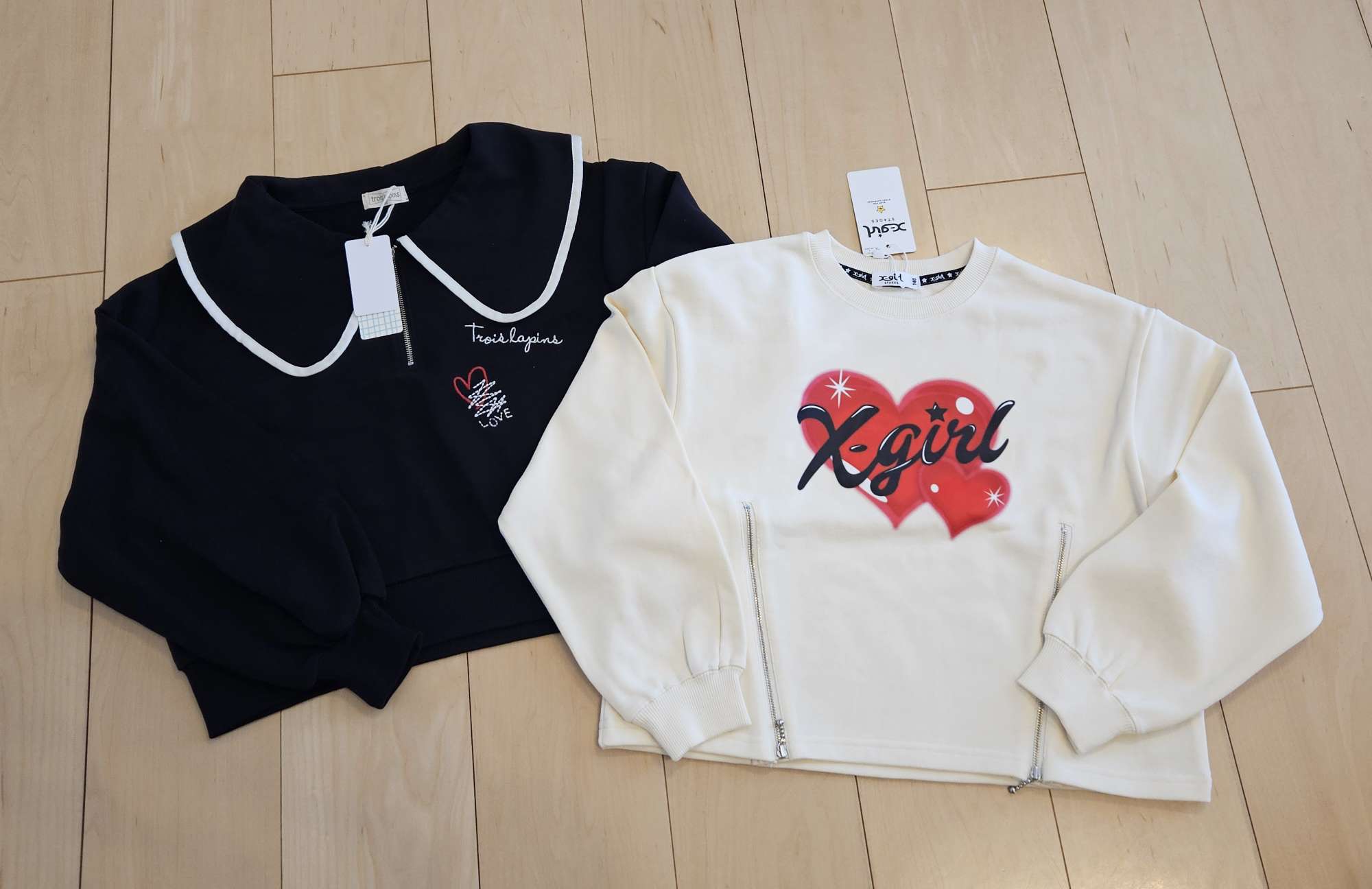 こんにちは。マラソンもうすぐ終了ということで頑張って写真撮りました!休みなのに休んでないぞー。娘は夕方までバレー。私は午前学童の会議、もう少ししたら子供会の会議です。年度末が近づいてるのでどちらもバタバタです。みんな子供会ってあるのかな?ここは盛んな地域で子供が子供会入ってなくても、親は役員回ってくるんですよね💧私はアンチ子供会ではあったんですが、娘は私に似てw積極的にイベント参加するタイプで子供会の恩恵をめっちゃ受けてるので、今は役員することも受け入れてます。さてさてタイトルの件。ナルミヤさんで1000円offクーポン使って意気揚々とポチしましたが、どちらも値下げになってます。クーポンの意味…。もちろんまだ着せてません。★ハートグラフィティジッププルオーバー、アイボリー140、8910円→4455円(50%off)しつこいですが、本店さんではポチ翌日に60%offになりました。娘がデニムか黒パンツぐらいしか履かないので合わせやすいアイボリーにしました。エックスガールを好んで着せてますが、なるべく可愛いデザインを選んでます。そうじゃないと着てくれないので。★ビッグカラートレーナー、黒150、6490円→4543円(30%off)久々にラパンのお洋服買いました。こちらも今日から半額ですよー( ;∀;)イロチ買おうかなと思うぐらい好き。襟つき可愛い~( 〃▽〃)袖にも刺繍✨着せてみました。パンツもエックスガール140ファスナー開けて着るのは嫌らしい。エックスガール ステージス(X-girl Stages)ハートグラフィティジッププルオーバー(KP)troislapins(トロワラパン)ビッグカラートレーナー(140~160)これも買えばよかった。絶対に娘好きなやつ。(KP)troislapins うさぎワッペン長袖Tシャツ(140~160)迷ってるうちに売り切れた。アイボリーあります。ピンクラテ(PINK-latte)もふもふ エコファーブルゾンエックスガールはもう今季買うものないかなー。エックスガール ステージス(X-girl Stages)肩ラインハーフジップカーゴワンピース欲しかった~💧エックスガール ステージス(X-girl Stages)配色リブバックロゴプリントトレーナー半額(KP)troislapins(トロワラパン)鹿の子ボーダーワンピース(140~160)(KP)troislapins(トロワラパン)ウォッシャブルベスト&Tシャツセット(140~160)