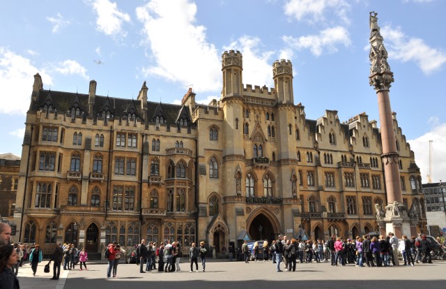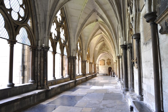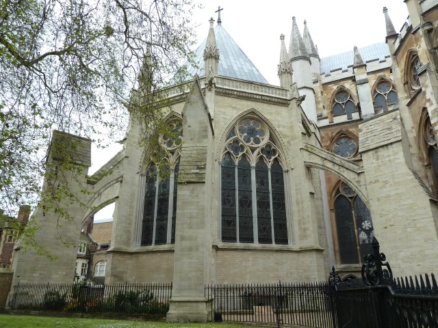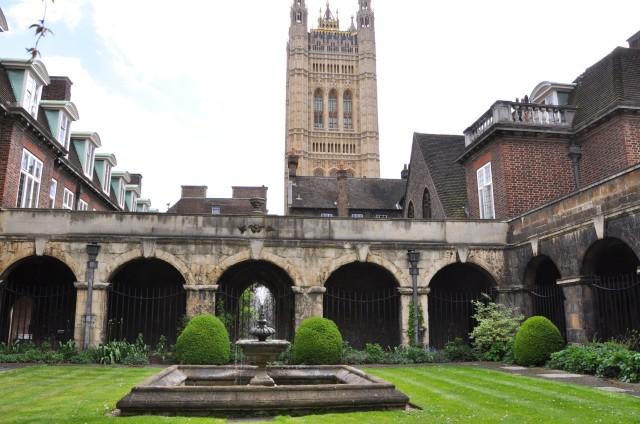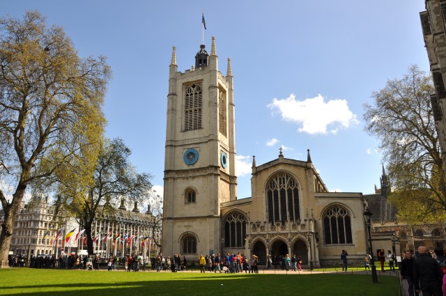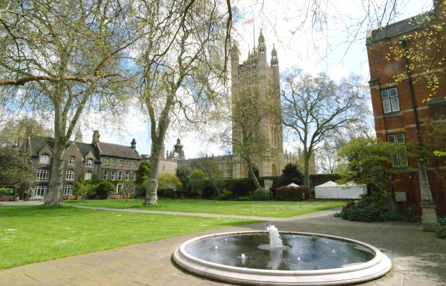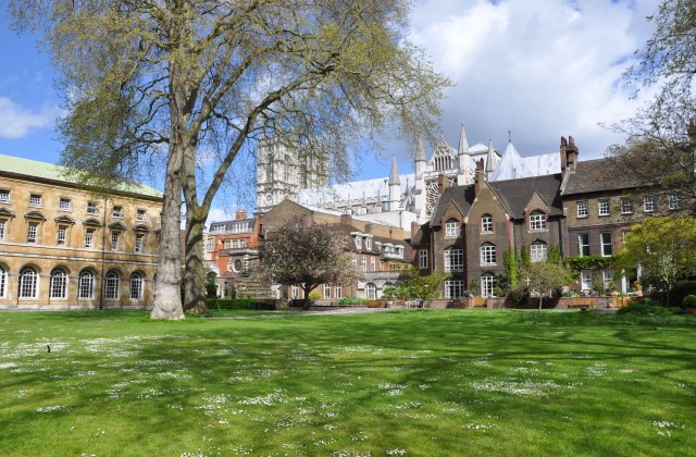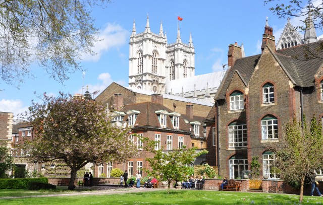 奥に見えるのがウェストミンスター寺院。その手前のレンガの建物がWestminster Schoolで、左に見えるゲートがスクールの広場につながっている。