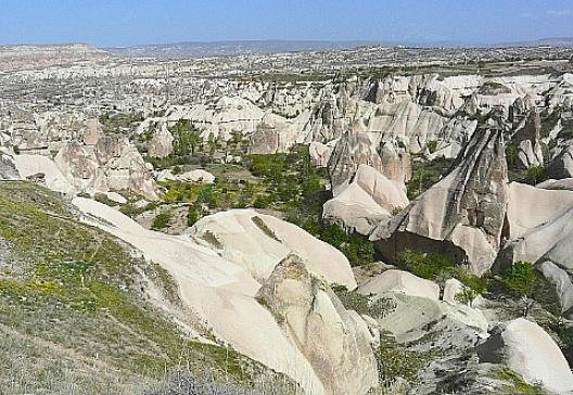 アナトリア半島そのものと言えるトルコの国は、古来アジアとヨーロッパを繋ぐ戦略的に重要な地点に位置するため、先史時代からいくつかの文明の発祥地となっています。(人類最古の定住遺跡と言われるチャタル・ヒュユクも同国内に。)地理、歴史、地質に関しても見所満載の面白い国がトルコです。その中でもやはり見所は歴史を無視して気楽に楽しめるカッパドキアなのです。カッパドキアは、アナトリア平原のほぼ中央にあり、長い年月をかけて自然が生み出した奇跡の台地です。まずはアナトリア平原を高台から・・広くて一望はできませんが・・・。(最初にここから入ったら良かったかも・・・。)トルコ共和国(Republic of Turkey)中部アナトリア地方カッパドキアギョレメ地方(Goreme)ギョレメ国立公園(Goreme National Park and Rock Site of Cappadocia)アナトリア平原のほぼ中央にあるギョレメ地方は、広大なカルデラのように囲まれた中の土地と言った方がイメージしやすいかも知れません。ウチヒサールの近郊の高台から撮影少しズームすると右に三角きのこの妖精煙突が見えています。ギョレメの村はその向こうです。村のさらに奥には白いバレーやその他奇岩が・・・。最初の写真の右の方に向きを取って撮影。平原はまだ右の方面にも広がっています。手前の岩はピンク・バレー・の裾野だと思います。上の写真は浸食されたアナトリア平原の台地。他の時に紹介するので細かい説明はしませんが、この奇岩のてっぺんは、ほぼ同じ高さで、浸食が始まる前はその高さまで台地があった事を意味しています。要するに、アナトリア平原の特にギョレメ地方の奇岩は浸食されてスカスカになって出来た台地なのです。一見平らに見える台地はさらに深くきざまれている(地に潜って・・)渓谷と呼ばれる場所もあり、ポイントポイントの景色が極端に違う見所を持っている訳です。ウュルギュップの三美人の岩は前にも紹介しましたが、このあたりは、このようなシメジ型の奇岩があちこち生えています。何だかサークル・ストーンにも見えますが、浸食の結果です。浸食は岩の成分によって姿を面白くしてくれます。広大な平原がまだ奥に広がっています。見えてはいますが、かなり途方もなく広い平原です。ここではこんな観光の仕方もGoodです。絶景でしょうね。写真撮りまくりだろーな。こんな全体像から次回、妖精煙突あたり?