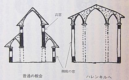 ディンケルスビュール 3 (聖ゲオルク教会とハレンキルヘ)ドイツ連邦共和国(Federal Republic of Germany)バイエルン( Bayern)ディンケルスビュール(Dinkelsbuhl)聖ゲオルク教会(St Georgkirche)ハレンキルヘ(建築のスタイルの一つ)聖水盤 講壇(pulpit)教会は西が正面(入り口門)になるように建てるのが大原則なのだそうです。(敷地の関係で例外もあるようですが、大聖堂は広い敷地に建設するのでほぼ西向き。)古代エジプトでは死者は西方に葬られたそうです。古来から西は日が沈む方向なので、死者が安らぐ天国の方向とされたから・・と書いてある本もありますが・・・。私の仮説では、欧州からすると東の内陣の主祭壇がエルサレムの方面を向くから・・・かな? と、思っていました。(どこかで正解を見つけたらお知らせします。)聖ゲオルク教会(St Georgkirche)ヴェルニッツ門を入ってまもなく現れる聖ゲオルク教会は10世紀頃は小さな礼拝堂だったようです。12世紀にロマネスク様式の教会になり、15世紀にまた改築され(1448~1499年完成)ゴシック式のハレンキルヘ型で建築されました。(前回紹介した正面入り口と塔だけはロマネスク時代のもの。)もちろん教会の守護聖人は聖ゲオルクです。ハレンキルヘ(建築のスタイルの一つ)ドイツ語でハレ(Halle)は英語のホール(Hall)の意で、会堂だそうです。前回の外観で気づかれたかと思いますが、ゴシックの教会堂にしてはめずらしい形をしています。ハレンキルヘのスタイルは身廊と側廊の天井までの高さを同じにしたもので、外壁が高くなる分窓も高く長くもうけられるので、教会内部は非常に光源が入って明るくなるのです。写真左が普通のゴシック建築で、右がこの聖ゲオルク教会の形であるハレンキルヘ型。ハレンキルヘ型は、神秘性を追求した従来の型よりも、説教を重視したドイツに多く見られる工法だそうです。写真左が外壁側で、中心が側廊の天井、右にかすかに見えるのが身廊部分。天井まで21.3m、窓は16m。戻って入り口から・・・。入り口に入ってすぐに聖水盤があります。左に講壇もあるので注意。聖水盤(上の写真の右下)は必ず入り口に向かってあるそうです。それは、聖水盤の水によって、バプテスマ(洗礼、浸礼)の儀式が行われるからで、バプテスマを受けると言う事は、教会共同体への入会(信徒になる)を意味します。本来バプテスマを受けた者でなければこの先は立ち入れない聖域なのでしょう。教会入り口を振り返ると上にはパイプオルガンがあります。注目は右の美しい講壇です。講壇身廊の設備で三番目に重要なのが講壇と言われる台座or朗読台です。そこでは、聖職者が礼拝の指揮をとり、聖書が読み上げられたり、訓話が説かれたりします。講壇は簡素なものから精巧な彫刻のついた物まで、時代によってもいろいろあります。ただ、昔の講壇が残っているのは少ないです。たいていの講壇は、福音書記者であるマタイ、マルコ、ルカ、ヨハネを象徴するデザインとして、天使、ライオン、牡牛、鷲などがデザインされるようです。(聖書を朗読する場所だからでしょう。)講壇のデザインは、聖ゲオルクとマルコのワシがあるのは解りますが、後は当時の建設に携わった司教かもしれません。近年の講壇は机のような朗読台といったシンプルなものが多いです。ここのように教会の身廊にあつらえられた、彩色豊かな完璧な講壇が残っているのは案外めずらしいかと思います。大理石だからここのは今も使えるでしょうが、木造りの物は木が朽ちて壊れている物が多いです。聖堂内陣方向ここから先は、本当に聖域で一般の人は入れません。主祭壇の手前にもかなり古いゴシックの講壇がありますね。ちょっと遠くて写りが今一ですが主祭壇です。キリスト像が中空に吊されているようですが、いつもなのかはわかりません。ディンケルスビュールつづく