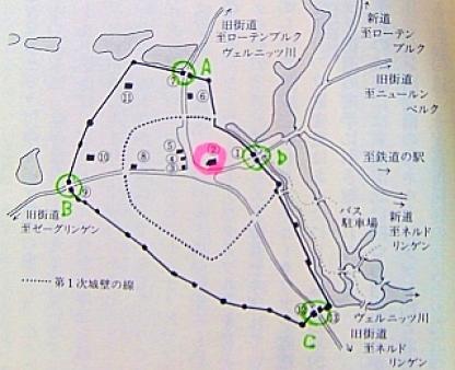 ディンケルスビュール(Dinkelsbuhl)の街の城壁と門を一部紹介です。残念ながら全ての門の写真が無いので・・。ディンケルスビュール 4 (城壁と城門)ドイツ連邦共和国(Federal Republic of Germany)バイエルン( Bayern)ディンケルスビュール(Dinkelsbuhl)ロマンティック街道中世の病院と宿交易路の中継ポイントロマンティック街道「ロマンティック街道」の名を聞いた事があると思います。ディンケルスビュールは、その街道に含まれる一つの街です。ロマンティック街道は南ドイツの街、ヴュルツブルク~フュッセンまでの約350km。中世の街並が色濃く残る所からドイツ観光局が「ロマンティック街道」と名付けたそうです。ディンケルスビュールは中世の街並もさる事ながら、街を取り囲む城壁がほぼ完璧に保存されている3つの街の一つです。因みに後の2つはローテンブルクとネルトリンゲンです。ディンケルスビュール地図太い線が街を取り囲む城壁。その中のが昔の城壁跡です。(昔の城壁跡の外堀が、今はは街の道路になっています。)ピンクが聖ゲオルク教会。A、B、C、Dがこの街をとり囲む4つの門です。A ローテンブルク門(北)・・・ローテンブルクに至る街道の門B ゼークリンゲン門(西)・・・ゼークリンゲンに至る街道の門C ネルドリンゲン門(南東)・・・ネルドリンゲンに至る街道の門D ヴェルニッツ門(東)・・・・ヴェルニッツ川沿いの門ローテンブルク門を城外から撮影。城門の下部は1390年頃に建築。上部の塔は16世紀にできたそうです。塔には市の紋章(左)と帝国自由都市を現す鷲の紋章が入っています。塔内の部屋は牢獄として使われていたそうですが、横になることもできないくらい狭い部屋もあったそうです。現在この門ははバスの通過がは禁止されています。基本的に宿泊のお客さんでなければ街へのバスの入場は禁止されており、観光客は城外から歩いて中に入り観光します。ローテンブルク門を城内から撮影。中世の病院と宿右の建物は、1280年に設立された聖霊ジュピタールで、病院と旅人の宿舎を兼ねた建物だったようです。現在は城内ですが、当初の城壁時代は、城門の外にあったことになります。それは、中世は疫病などが度々起きたので、市民への幹線を防ぐ為に病院は街の外に置かれたと言う事です。また、中世、城門は夜一定の時間に閉門された為に時間外に到着してしまった旅人は、聖ジュピタールに泊めてもらうしかなかったようで、宿の用途も生まれたのでしょう。年々街が拡大する中で、1370年~1380年にかけての新しい城壁(現在の壁)作りの結果、城壁内に入ったようです。交易路の中継ポイントデインケルスビュールは、古来ドイツの東西と南北を結ぶ重要な交易(街道)の交点にあり、そうした理由から街は10世紀頃に市場街として誕生したようです。(東西南北のいろいろな諸国の物産が集まるのでマルクト広場もいろいろあったようです。)北はバルト海方面に、南はイタリア、ヴェローナに、東はプラハ方面、西はライン湖畔のヴォルムス(カール大帝の王宮の一つがあった)に繋がっていたようです。特に南北のイタリアからバルト海への街道は、古代ローマ時代からの幹線道路なのだそうです。ローテンブルク門の右に伸びると城壁と、城壁角の見張り塔。冬の方が城壁が良く見えます。上の写真の夏のバージョン。ベルニッツ川岸の見張り塔。このラインは旧城壁がそのまま残った場所です。ネルトリンゲン門方面につながる城壁。外堀のように長く続く、ヴェルニッツ川につながる洪水調整池。次回街の目玉の一つドイチェス・ハウスを紹介して終わります。