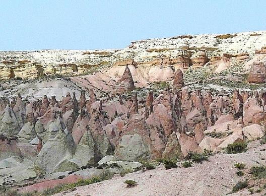 トルコ共和国(Republic of Turkey)中部アナトリア地方カッパドキアギョレメ地方(Goreme)パシャバー地区(Pasabag)修道士の谷奇岩のできかた図の左が2000万年前に起きたカッパドキアの3つの山、(エルジイェス、ハサン、ギュルル)火山の噴火によって火山灰(凝灰岩)が降り積もり形成されたカッパドキアの台地図の右が長い年月かけて水に溶解しやすい石灰岩などの岩石のみ溶けて、台地がけずれるように浸食される図。特異なカルスト地形の帽子をのせたような奇岩はこうして生まれたようです。写真左右、崖からもうすぐ生み出されてくる「きのこ岩」左は綺麗な三角錐の帽子がすでに乗っています。写真中央の岩からも、もう少しで誕生。左下のような丸まった帽子を持つキノコ岩もありますし、写真右の岩は、また造りが違いますね。写真右の岩は浸食されたしシメジ茸型の上に溶岩でも塗布されたような感じですね。粘質の火山灰が厚みをもって降り積もった跡かも知れません。修道士の谷の山側は、ここも浸食の度合いで微妙な谷がいくつも出来ています。上の写真の右側のパノラマ。次回ゼルベのラクダ岩につづく
