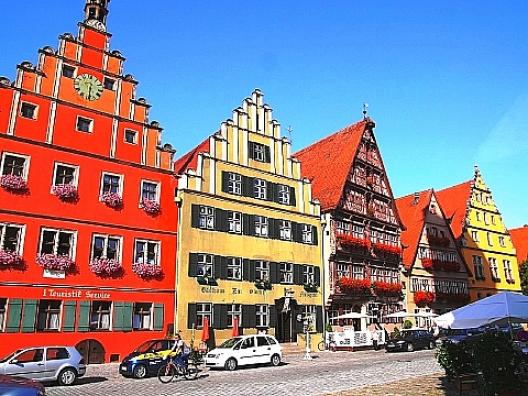 ディンケルスビュール 5 (ドイチェス・ハウス)ドイツ連邦共和国(Federal Republic of Germany)バイエルン( Bayern)ディンケルスビュール(Dinkelsbuhl)ドイチェス・ハウス(Deutsches Haus)ドナウ川支流のベルニッツ川の畔、19の塔をつないだ城壁の都市は、当時の人口6000人、今も8500人と人口もさほど変わらず、(前にも紹介しましたが、)他の都市のように三十年戦争でも、第二次世界大戦でも戦災を受けず、12~16世紀頃の昔の景観を残している街なのです。聖ゲオルク教会前のワインマルクト通りワイン取引の市場だったワインマルクト街の中心聖ゲオルク教会前のマルクト(広場)は、今は交差点になっているので一見広場には見えませんが(ツリーの建った場所)、そこからローテンブルク門方向に伸びる道幅の広い通りはかつてワインマルクト(Weinmerkt)だったようです。(途中マルテインルター通りと名を変えてローテンブルク門に至)ローテンブルク門の方面から教会のあるマルクト広場を望むワインマルクト通りこの道はかつての城壁横の堀の跡らしい。ワインマルクトの前に15世紀から残る古い木骨組みの家があります。ドイチェス・ハウス(Deutsches Haus)1440年頃に建てられた木造7層の建物は、ドイツでも指折りの豪華な木骨組みの家として名高く、もとは豪商の館だったそうです。写真左がこの街最古の木造建築。その右2軒目が昔の穀物倉庫で、現在は祝祭ホール。現在は1階がレストランで上はホテルです。ドイチェス・ハウスとは一種の屋号だそうです。木造とはいえ豪華に彫り込みされた造りのこの家は、少し変わった工法で建築されています。上の階に行くほど前に突き出てくる造りになっています。実際上に行く程各フロアは広くなっているようです。マッチ箱を重ねたような・・と表現されていますが、いわゆる2×4(ツーバイフォー)で造られた各フロアを上に積み上げて造られた・・・といった建築のようです。壁は一見漆喰だけに見えますが、中はレンガや石を積み上げた強固なものになっているそうです。ドイチェスハウスの1階レストラン内部570年建ってもしっかりした内部の造りはさすが、ドイツといった感じです。ネルトリンガー通り子供祭り(キンダーツェッヒェ)7月の中旬に「子供達にご馳走しよう」と言う祭りがあるそうです。三十年戦争(1618年~1648年)で街がスウェーデン軍に攻められた時に、この街の子供達が「街を助けてください。」と懇願して救われたと言う史実にちなんでもうけられた祭りなのだそうです。子供達は当時の衣装を身にまとい、寸劇もあるようです。おわり