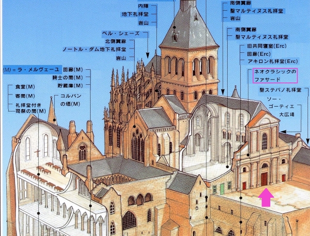 左手前(北面)ゴシック3層構造のゴシック建築の部分であるが、全てひっくるめてラ・メルヴェイユ(La Merveille)と呼ばれる。