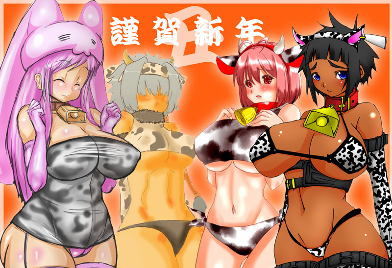 新年明けましておめでとうございます!どうもボクです(’’ついに2009年がやってきましたyp!地デジ完全実施まであと2年ですな!(ぇ今年もなにとぞ宜しくお願い致します絵チャにて、あっしがイスナさんの案を元に発案した正月合作オーヴァーハンドレッド娘で丑年を彩ろう企画(ナンジャソリャ)で皆様から頂いた看板娘さん(きょぬー100オーヴァー)達をあっしが一つにまとめたイラストをwちなみに左から銅眼鏡・改さん、あっし、イスナさん、くまさんのブログの看板娘さん達になっていますwいあーこの企画に賛同してくださった3人には感謝感激ですz!wありがとうございましたwおまけであっしのところので作った単品を(笑)んでわw今年もよいお年を!